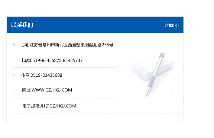 傳真:0519-83435688    郵編:213135    網址:WWW.czjhgj_com.yh-xc.com    電子郵箱:JH@czjhgj_com.yh-xc.com